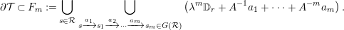 $$\begin{eqnarray}\unicode[STIX]{x2202}{\mathcal{T}}\subset F_{m}:=\mathop{\bigcup }_{s\in {\mathcal{R}}}\mathop{\bigcup }_{s\xrightarrow[{}]{a_{1}}s_{1}\xrightarrow[{}]{a_{2}}\cdots \xrightarrow[{}]{a_{m}}s_{m}\in G({\mathcal{R}})}\left(\unicode[STIX]{x1D706}^{m}\mathbb{D}_{r}+A^{-1}a_{1}+\cdots +A^{-m}a_{m}\right).\end{eqnarray}$$