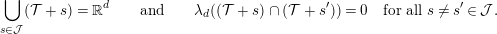 $$\begin{eqnarray}\mathop{\bigcup }_{s\in {\mathcal{J}}}({\mathcal{T}}+s)=\mathbb{R}^{d}\qquad \text{and}\qquad \unicode[STIX]{x1D706}_{d}(({\mathcal{T}}+s)\cap ({\mathcal{T}}+s^{\prime }))=0\quad \text{for all }s\neq s^{\prime }\in {\mathcal{J}}.\end{eqnarray}$$