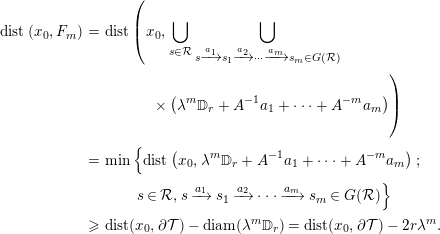 $$\begin{eqnarray}\displaystyle \text{dist}\left(x_{0},F_{m}\right) & = & \displaystyle \text{dist}\left(x_{0},\mathop{\bigcup }_{s\in {\mathcal{R}}}\mathop{\bigcup }_{s\xrightarrow[{}]{a_{1}}s_{1}\xrightarrow[{}]{a_{2}}\cdots \xrightarrow[{}]{a_{m}}s_{m}\in G({\mathcal{R}})}\right.\nonumber\\ \displaystyle & & \displaystyle \quad \qquad \left.\times \left(\unicode[STIX]{x1D706}^{m}\mathbb{D}_{r}+A^{-1}a_{1}+\cdots +A^{-m}a_{m}\right)\right)\nonumber\\ \displaystyle & = & \displaystyle \text{min}\left\{\text{dist}\left(x_{0},\unicode[STIX]{x1D706}^{m}\mathbb{D}_{r}+A^{-1}a_{1}+\cdots +A^{-m}a_{m}\right);\right.\nonumber\\ \displaystyle & & \displaystyle \qquad \left.s\in {\mathcal{R}},s\xrightarrow[{}]{a_{1}}s_{1}\xrightarrow[{}]{a_{2}}\cdots \xrightarrow[{}]{a_{m}}s_{m}\in G({\mathcal{R}})\right\}\nonumber\\ \displaystyle & {\geqslant} & \displaystyle \text{dist}(x_{0},\unicode[STIX]{x2202}{\mathcal{T}})-\text{diam}(\unicode[STIX]{x1D706}^{m}\mathbb{D}_{r})=\text{dist}(x_{0},\unicode[STIX]{x2202}{\mathcal{T}})-2r\unicode[STIX]{x1D706}^{m}.\nonumber\end{eqnarray}$$