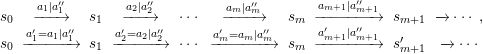 $$\begin{eqnarray}s\xrightarrow[{}]{a_{1}|a_{1}^{\prime }}s_{1}\xrightarrow[{}]{a_{2}|a_{2}^{\prime }}\cdots \in G({\mathcal{S}}).\end{eqnarray}$$