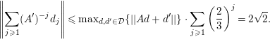 $$\begin{eqnarray}\left\Vert \mathop{\sum }_{j\geqslant 1}(A^{\prime })^{-j}d_{j}\right\Vert \leqslant \text{max}_{d,d^{\prime }\in {\mathcal{D}}}\{||Ad+d^{\prime }||\}\cdot \mathop{\sum }_{j\geqslant 1}\left(\frac{2}{3}\right)^{j}=2\sqrt{2}.\end{eqnarray}$$