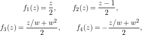 $$\begin{eqnarray}\displaystyle & \displaystyle f_{1}(z)=\frac{z}{2},\qquad f_{2}(z)=\frac{z-1}{2}, & \displaystyle \nonumber\\ \displaystyle & \displaystyle f_{3}(z)=\frac{z/w+w^{2}}{2},\qquad f_{4}(z)=-\frac{z/w+w^{2}}{2}, & \displaystyle \nonumber\end{eqnarray}$$
