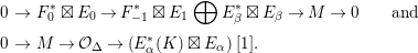 $$\begin{eqnarray}\displaystyle 0 & \rightarrow & \displaystyle {\mathcal{O}}(-6,-3)\bigoplus {\mathcal{O}}(-4,-2)^{2}\nonumber\\ \displaystyle & \rightarrow & \displaystyle E_{\frac{-11}{3},\frac{-5}{3}}\bigoplus {\mathcal{O}}(-3,-2)\rightarrow {\mathcal{I}}_{Z}\rightarrow 0\qquad \text{and}\nonumber\\ \displaystyle 0 & \rightarrow & \displaystyle {\mathcal{O}}(2,2)\rightarrow V\rightarrow {\mathcal{O}}(5,1)^{2}\rightarrow 0.\nonumber\end{eqnarray}$$
