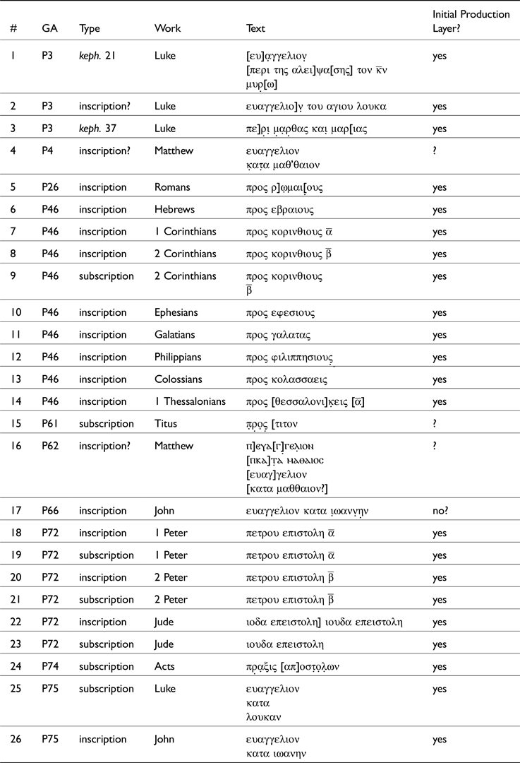 A second area that this discussion informs is practices of entitling in ancient literature. Multiple studies have explored the dynamics of titular traditions of classical literature, but these studies have only obliquely engaged material from the New Testament and the consequences of such studies have not yet been sufficiently considered by New Testament scholars in terms of thinking about the place of the papyri in the larger reading culture of the eastern Mediterranean.Footnote 8 Analysing all titles in New Testament papyri offers a platform for considering broader trends in the labelling of ancient works in the broader Roman world.