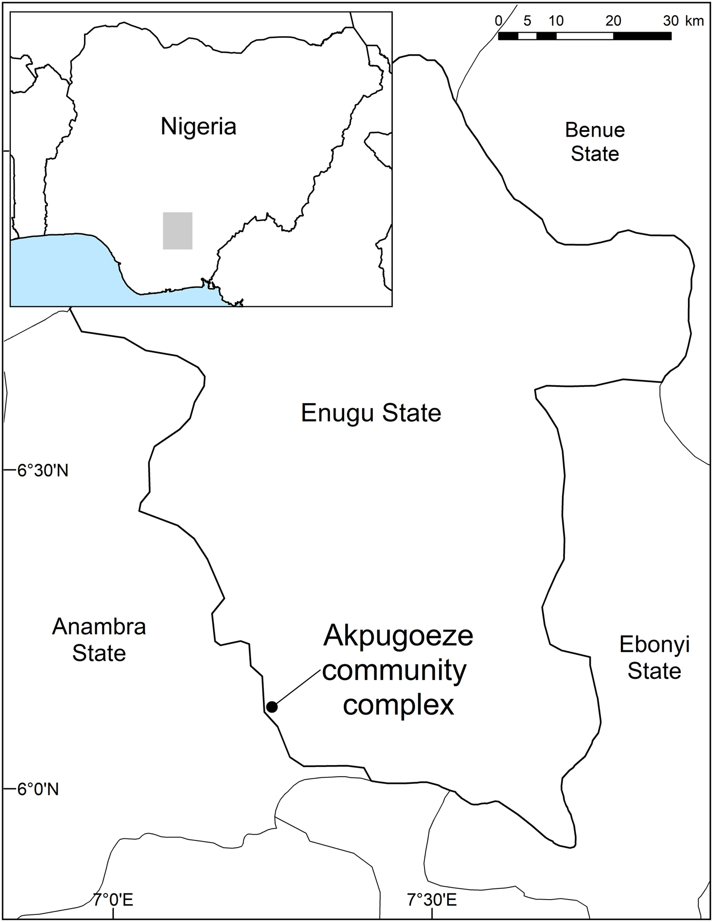 Fig. 1 Location of the Akpugoeze community complex in Enugu State, southern Nigeria. Formerly one politically autonomous community, Akpugoeze now comprises three politically independent communities.
