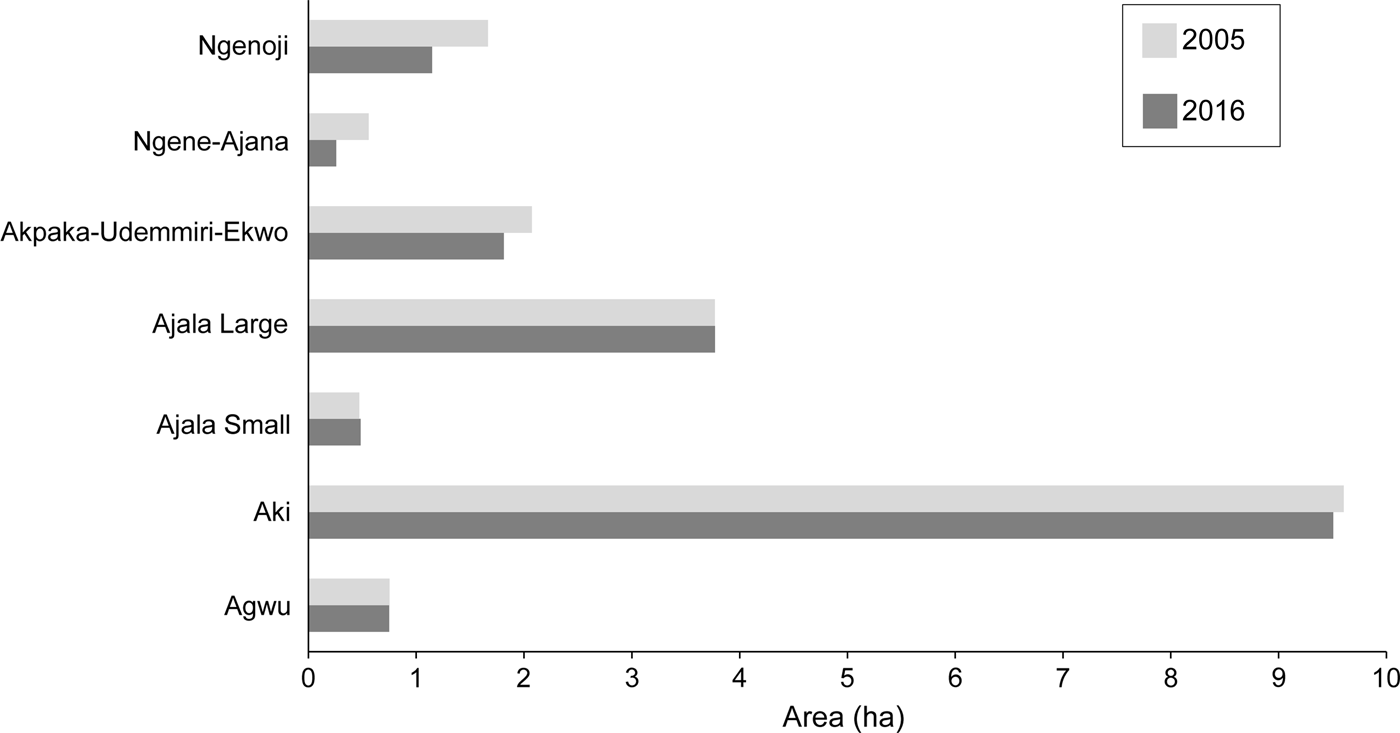 Fig. 2 Change in area of seven sacred groves in the Akpugoeze community complex, southern Nigeria (Fig. 1), between 2005 and 2016.