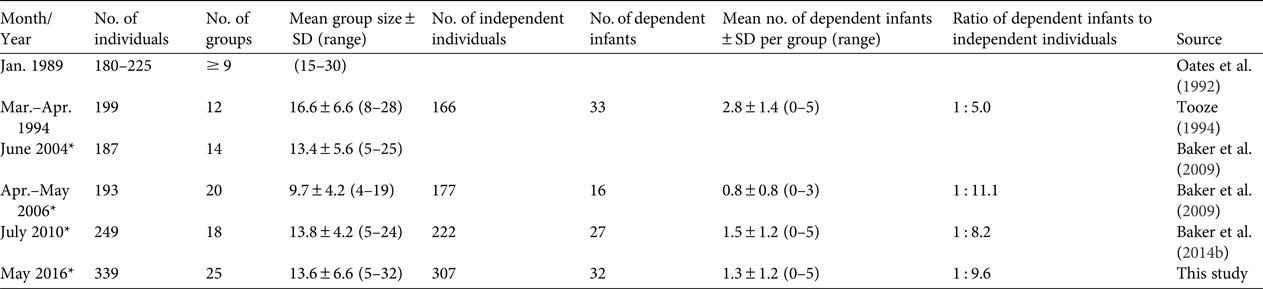 Table 1 Population estimates for Sclater's monkey Cercopithecus sclateri in the Akpugoeze community complex, Enugu State, southern Nigeria (Fig. 1), during 1989–2016, with number of individuals, number of groups, mean group size, number of independent individuals (adults and juveniles), number of dependent infants, mean number of dependent infants per group, ratio of dependent infants to independent individuals, and source of data. Blank cells indicate no data.