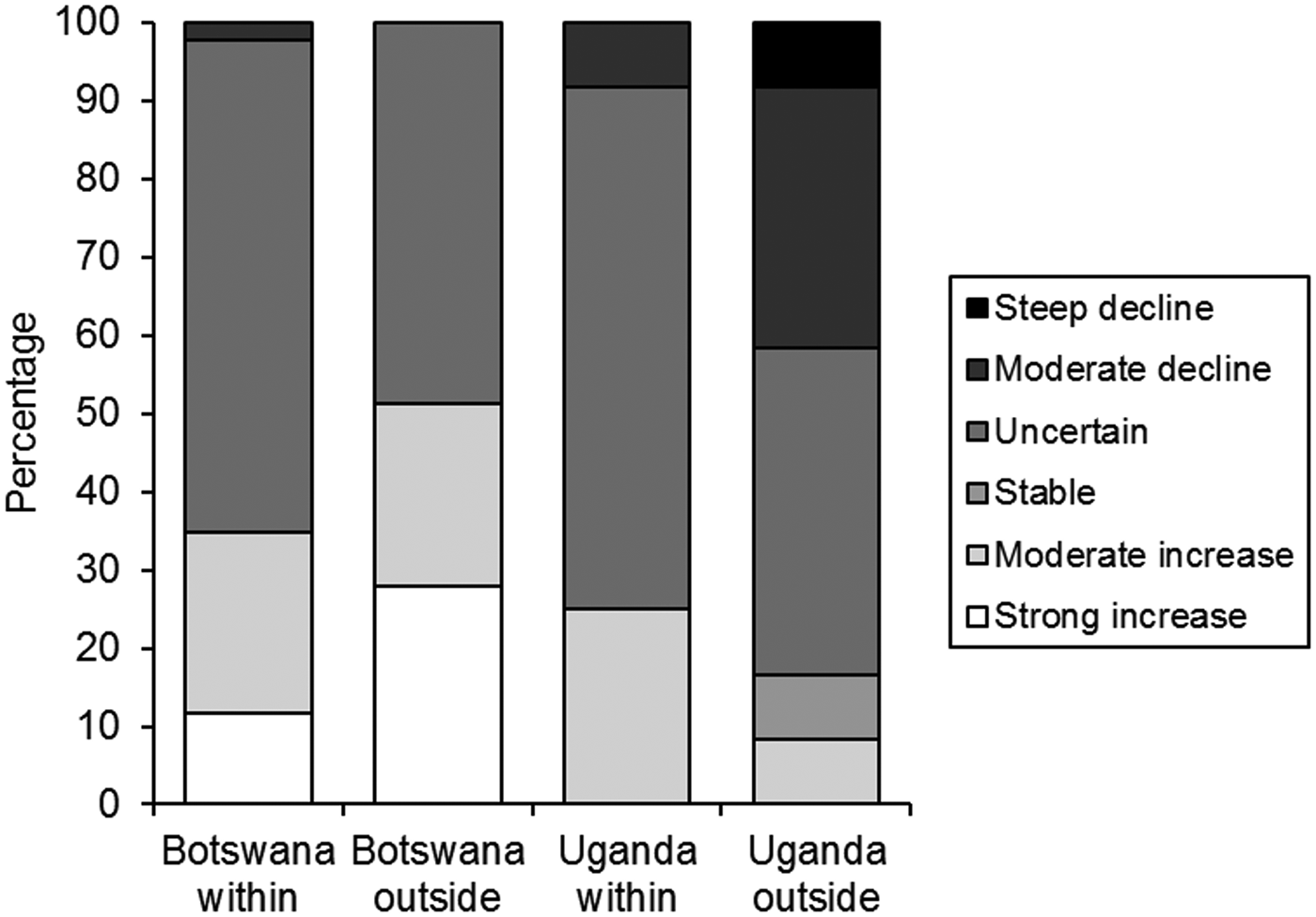 In Botswana the trend within protected areas was a significant moderate increase (+42%), and the trend outside protected areas was a significant strong increase (+80%, Table 2, Figs 10a & 11). In Uganda the trend within protected areas was stable and the trend outside was a moderate decline (−19%, Table 2, Figs 10b & 11).