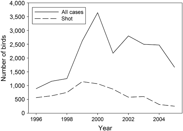 Fig. 2 Numbers of all birds and shot birds admitted each year over 1996–2005 to the Hellenic Wildlife Hospital.
