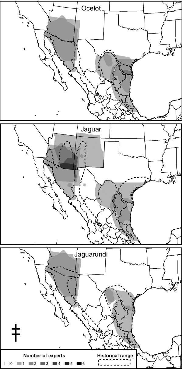 Fig. 1 Spatial coverage of participants' knowledge across the historical range of each of the three Neotropical felid species in the southern United States and northern Mexico.