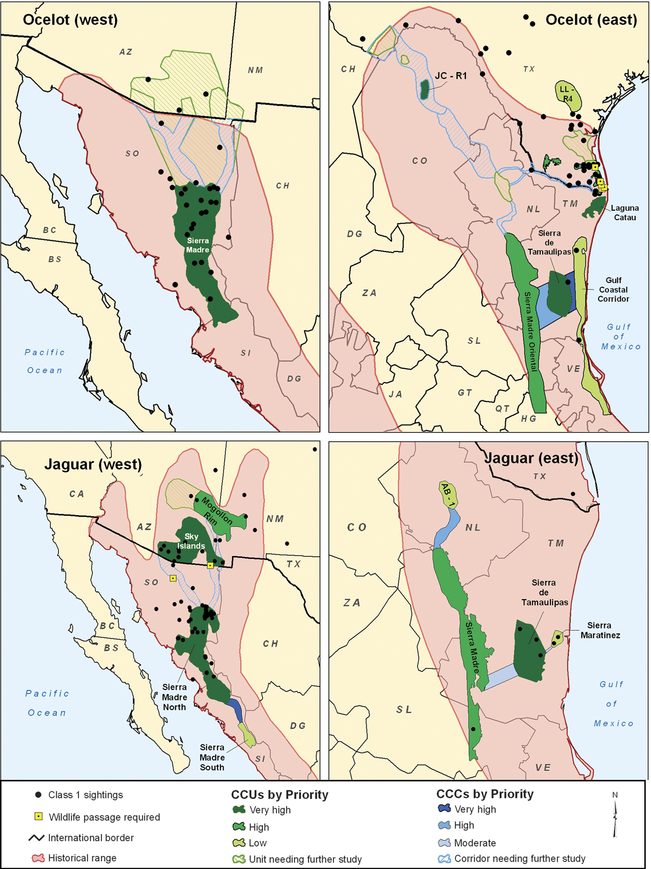 Another major outcome illustrated by this analysis is the need to obtain more information on the status of these three species of felid along the international border. Recent sightings of felids in the border region indicate they survive there but additional research is necessary in areas within 100 km of the border to understand better the ecological requirements and distributions of these three species. We believe it is this synthesis of knowledge on both sides of the border that is fundamental to the future protection of threatened and endemic fauna in this or any transnational region. As additional sightings continue to occur in the borderlands, and a new understanding emerges of its diverse inhabitants and their requirements for conservation, the Units and Corridors identified in this study will need to be revised. Only by doing so can we continue to make informed management decisions regarding these rare and cryptic species.