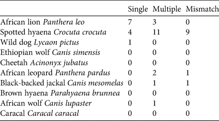Table 1 The alignment between central carnivore species and primary livestock depredator for 41 studies in sub-Saharan Africa published during 1997–2019, showing the number of studies in which the carnivore species responsible for the majority of livestock depredation was the only central species (single), one of multiple central species (multiple) or not a central species (mismatch) in the same study.