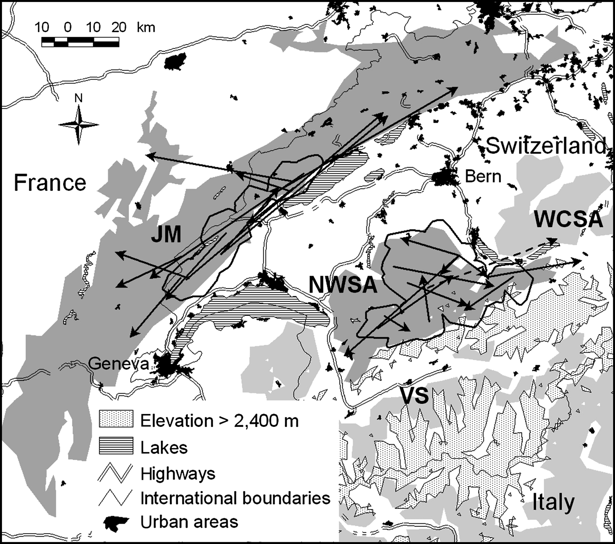 Fig. 1 Location of the study sites in Switzerland. Suitable lynx habitat patches in the north-west Swiss Alps (NWSA) and the Jura Mountains (JM) are dark grey; the adjoining patches of Valais (VS) and west central Swiss Alps (WCSA) are light grey. Thick black lines show the main study areas (see text for further details). Arrows indicate dispersal directions, distances and endpoints for 12 lynx in NWSA and 12 lynx in JM. Movements are shown as straight lines from a lynx’s natal home range centre or its capture site to its independent home range centre, mortality site or last location. All subadults settled in their natal habitat patch, except one male that left NWSA (dashed line).