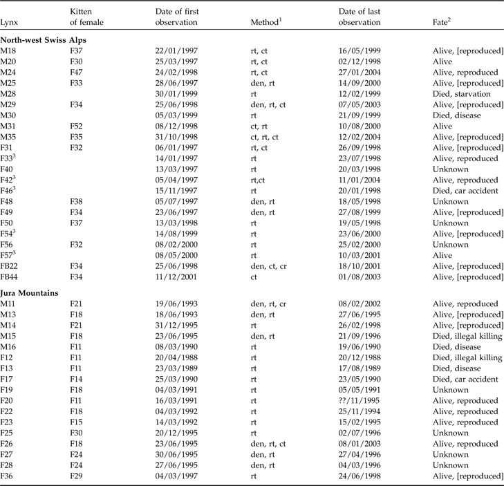 Table 1 Characteristics and fate of juvenile lynx (M, male; F, female; FB, females ear-tagged as juveniles) followed in the north-west Swiss Alps and the Jura Mountains (Zimmermann et al., 2005), with the maternal lines, date of first observation, method used to track each individual, and the fate of each individual.