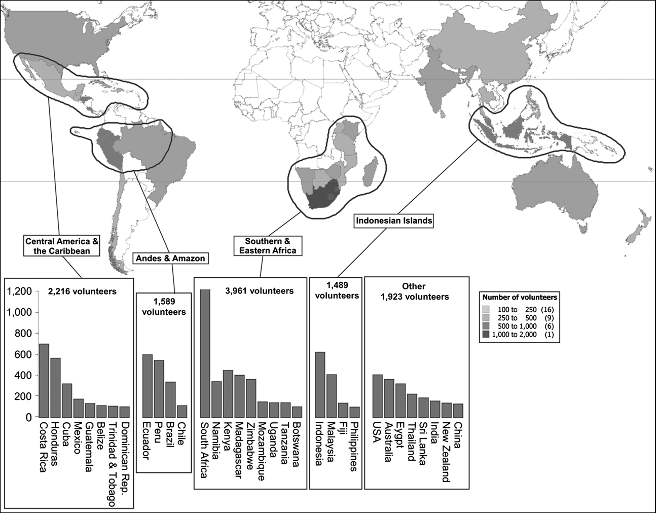 Fig. 1 The global distribution and national totals of conservation volunteer programmes in countries receiving >100 volunteers per annum.