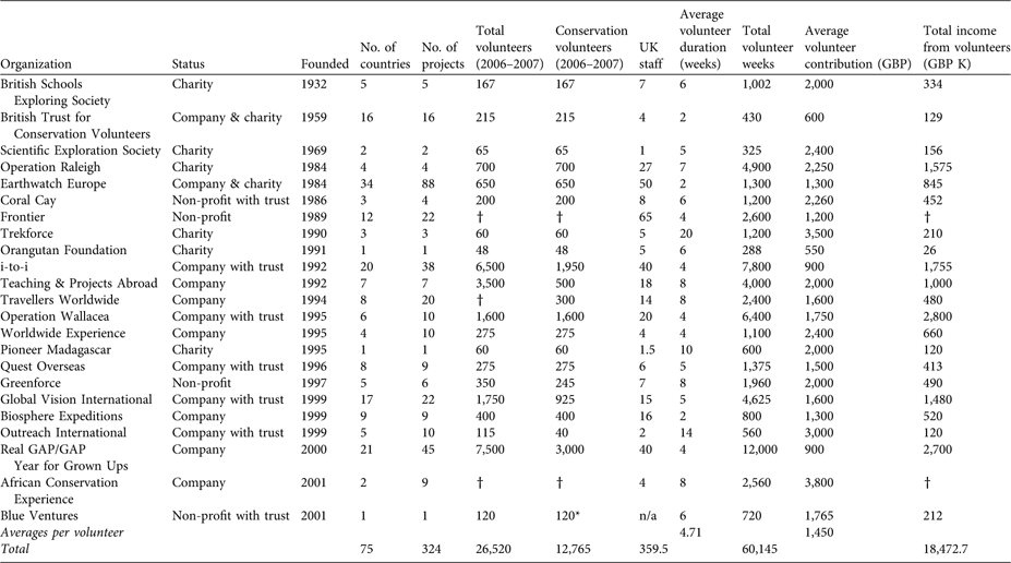 Although there are little numerical data available it is known that the number of people volunteering on conservation projects has increased dramatically since the early 1980s. This can be linked to the growing popularity of the pre- and post-university so-called gap year, growing numbers of active retirees and the broader enthusiasm for volunteering in UK society as a whole (Low et al., Reference Low, Butt, Ellis Paine and Davis Smith2007). In 2006–2007 12,195 fee-paying volunteers were posted to overseas conservation projects by the organizations represented in this study. They were employed on 324 programmes in 75 different countries.