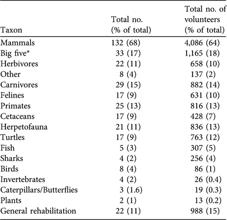 Within the taxon-specific programmes strong partialities are expressed towards mammals (68% of programmes and 64% of volunteers) over all other groups (Table 2). Furthermore, certain taxa are clearly prioritized. The so-called big five (white and black rhino Ceratotherium simum and Diceros bicornis, African elephant Loxodonta africana, buffalo Syncerus caffer, lion Panthera leo and leopard Panthera pardus), other carnivores, primates, turtles, other herbivores and cetaceans are the most popular targets for conservation programmes and their volunteers. The most popular single species is the lion, which is the target of 10 different programmes.