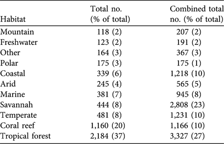 Table 3 shows the biogeographical division of the habitat-specific volunteer programmes according to the percentage of volunteers they receive. Tropical forests (37%) and coral reefs (20%) are the most popular biogeographical zones. Considering the geography of all volunteering programmes, both habitat and taxon-specific, then tropical forests (27%) and savannah type habitats (23%) are the most popular. Climatically, volunteer projects are clustered in tropical countries, which attract 73% of volunteers and 66% of projects.