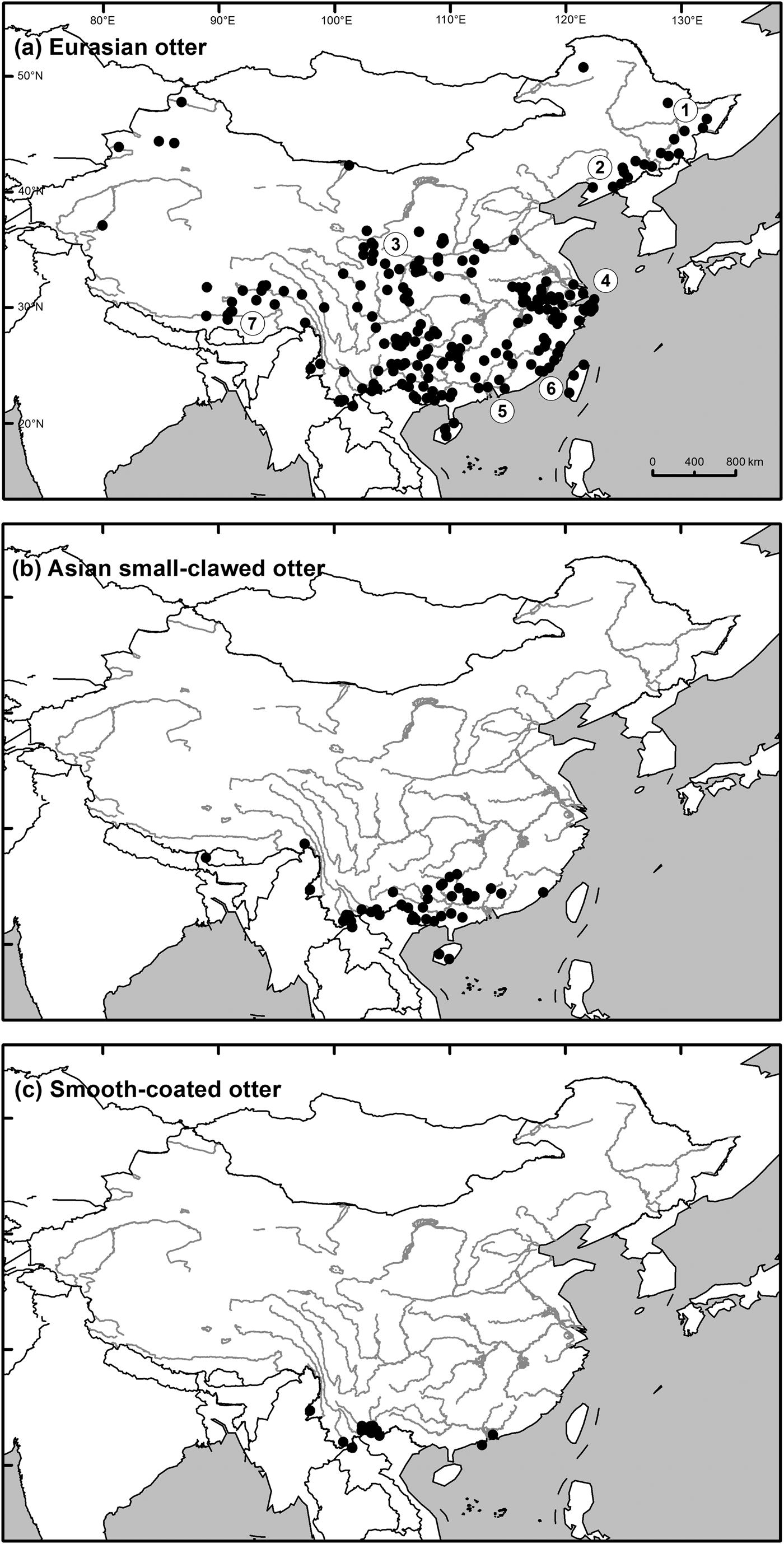 Fig. 1 Historical distribution (1950–2005) of (a) the Eurasian otter Lutra lutra, (b) the Asian small-clawed otter Aonyx cinereus, and (c) the smooth-coated otter Lutrogale perspicillata in China. Major river basins are numbered as follows: 1, Amur River; 2, Liao River; 3, Yellow River; 4, Yangtze; 5, Pearl River; 6, South-east coast; 7, Brahmaputra.