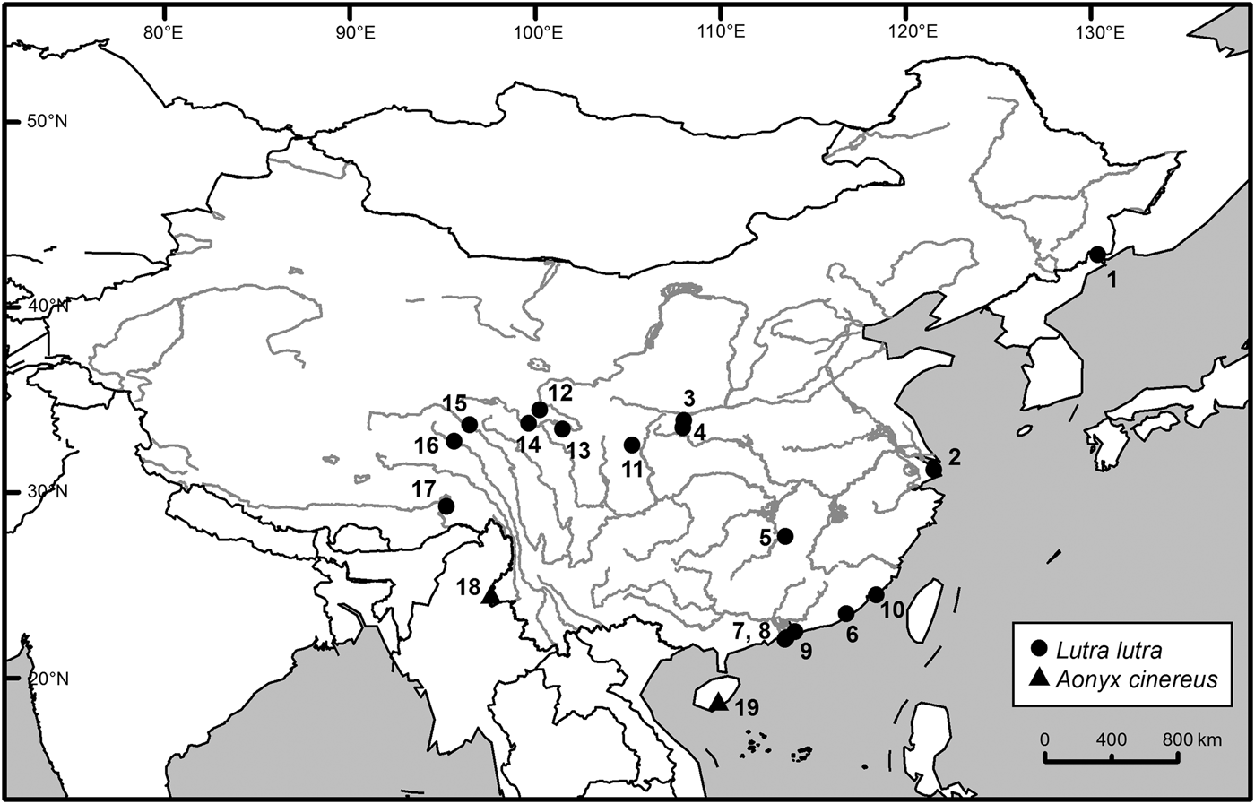 Otters are top predators in many freshwater ecosystems and serve as indicators of healthy aquatic environments (Kruuk, Reference Kruuk2006). In Europe and the Americas they are fairly common research subjects, and flagships for freshwater conservation (Mason & Macdonald, Reference Mason and Macdonald1986; González & Utrera, Reference González and Utrera2004; Recharte Uscamaita & Bodmer, Reference Recharte Uscamaita and Bodmer2010; Stevens et al., Reference Stevens, Organ and Serfass2011; Chanin, Reference Chanin2013; Balestrieri et al., Reference Balestrieri, Messina, Pella, Prigioni, Saino and Fasola2016). Although Asian otters are in general decline, otters remain relatively widespread and locally common in the Indian Subcontinent and South-east Asia (Raha & Hussain, Reference Raha and Hussain2016; Willcox et al., Reference Willcox, Visal and Mahood2016). In East Asia, however, the Eurasian otter Lutra lutra is extinct in Japan (Ando, Reference Ando2008; Hance, Reference Hance2012) and has not been recorded on Taiwan Island for over 2 decades (Lee, Reference Lee2015); and the Asian small-clawed otter Aonyx cinereus is either extirpated or extremely rare throughout much of its range in China (Wright et al., Reference Wright, de Silva, Chan and Reza Lubis2015).