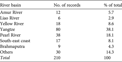 Distribution data were collated from scientific and grey literature (e.g. Hu & Wang, Reference Hu and Wang1984; Feng et al., Reference Feng, Cai and Zheng1986; Gao, Reference Gao1987; Zhang, Reference Zhang1997a; Huang et al., Reference Huang, Cui, Li, Li and Jiang2017). We also checked catalogued otter specimens deposited in the following institutions, for unpublished records: Guangdong Institute of Applied Biological Resources (n = 6), Kunming Institute of Zoology (n = 11) and Beijing Institute of Zoology (n = 5) of the Chinese Academy of Sciences.