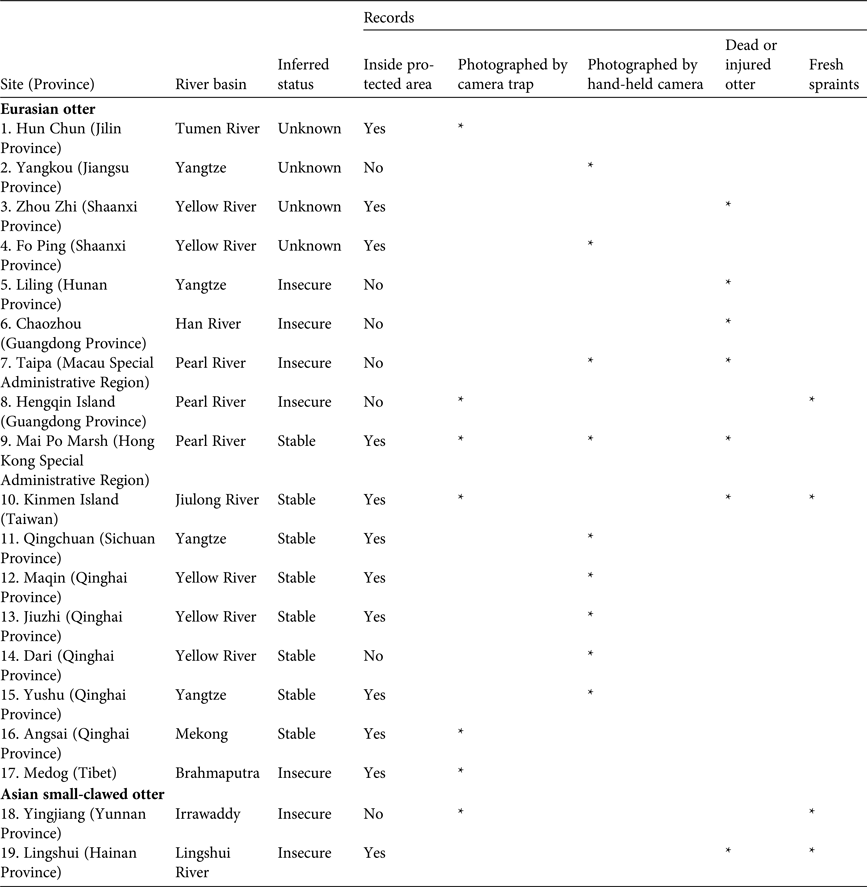 Table 3 Records of otters in China during 2006–August 2016 (Fig. 2), with site, river basin/drainage system, status/inferred status, and type of record.