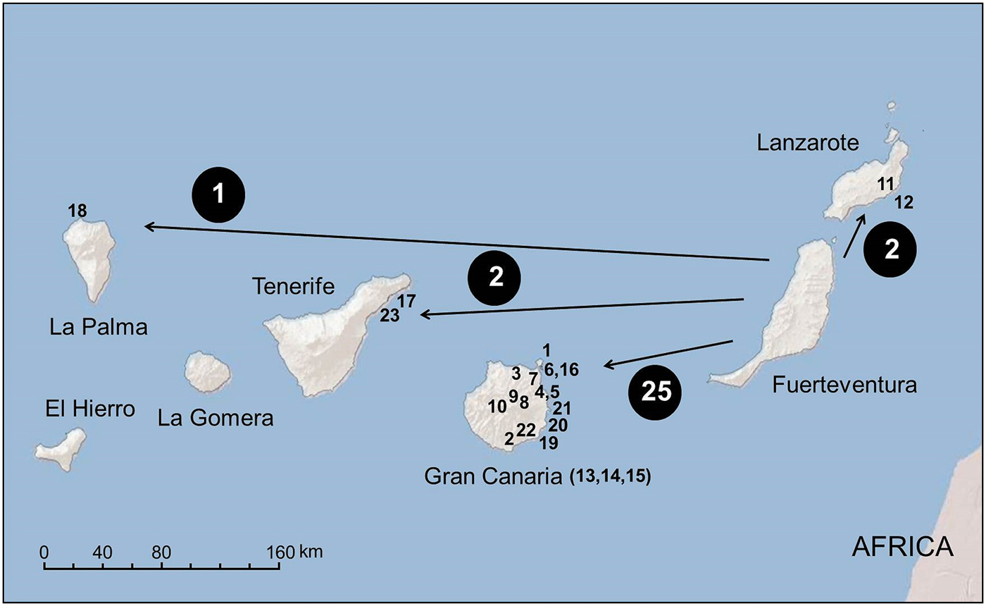 Fig. 1 The Canary Islands, showing the locations of all confirmed translocations of Barbary ground squirrels Atlantoxerus getulus during 1996–2016. Numbers correspond to the ID in Table 1. White numbers represent the total number of squirrels translocated to each island.