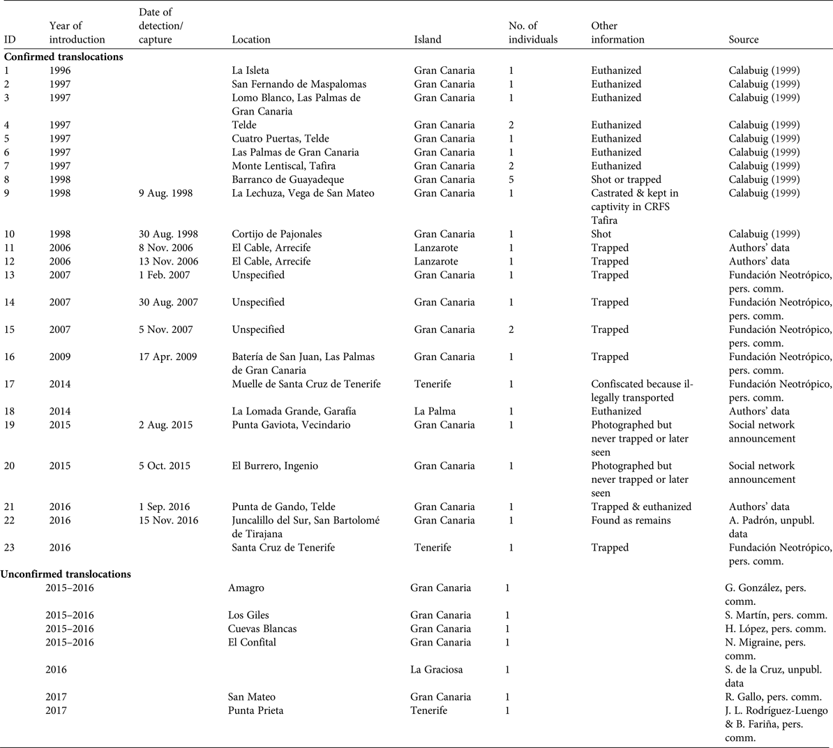 Table 1 All known confirmed and unconfirmed translocations of the Barbary ground squirrel Atlantoxerus getulus from Fuerteventura to elsewhere in the Canary Islands (see ID numbers in Fig. 1) during 1996–2017, with date of detection or capture if known.