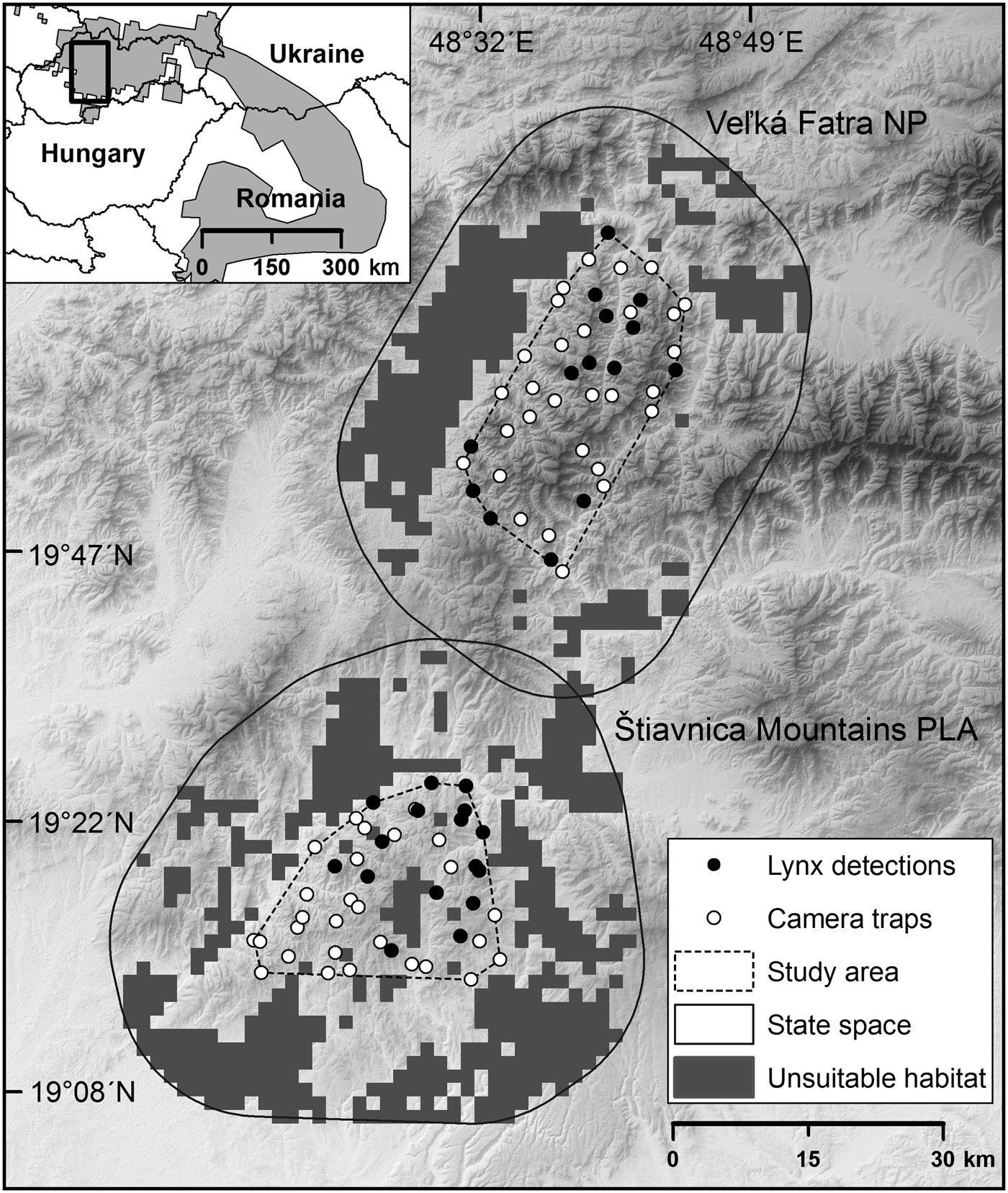 Fig. 1 Location of camera-trap stations in (a) Štiavnica Mountains Protected Landscape Area (PLA) and (b) Veľká Fatra National Park (NP) in the Carpathian Mountains of central Slovakia. Mean convex polygons were enlarged by buffers of 16 and 14 km, respectively, resulting in state-spaces in which we distinguished unsuitable (shaded) from suitable habitat fragments for the Eurasian lynx Lynx lynx. The shaded area in the inset shows the lynx's distribution in the Carpathian Mountains (Kaczensky et al., Reference Kaczensky, Chapron, von Arx, Huber, Andrén and Linnell2013).