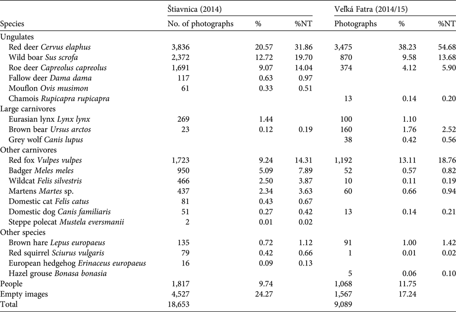 Table 1 Species detected during capture–recapture surveys for the Eurasian lynx Lynx lynx in Štiavnica Mountains and Veľká Fatra National Park, Slovakia (Fig. 1), during 2014–2015, with number of photographs, percentage of total photographs in each area, and percentage of photographs of non-target (NT) species.