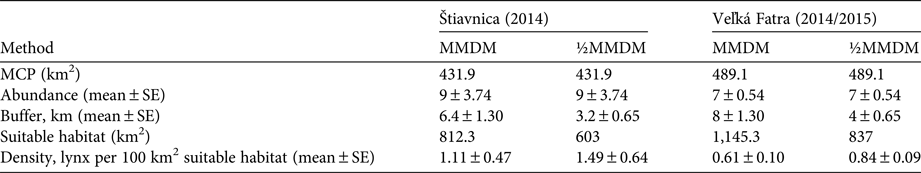 Table 3 Lynx abundance and density per 100 km2 of suitable habitat in Štiavnica Mountains and Veľká Fatra National Park estimated by means of the non-spatial heterogeneity model M h (Chao). The effective sampled area was restricted to suitable lynx habitat fragments within the areas formed by the minimum convex polygons (MCP) encompassing all camera-trap sites enlarged with two buffer widths: mean maximum distance moved (MMDM) and ½MMDM.