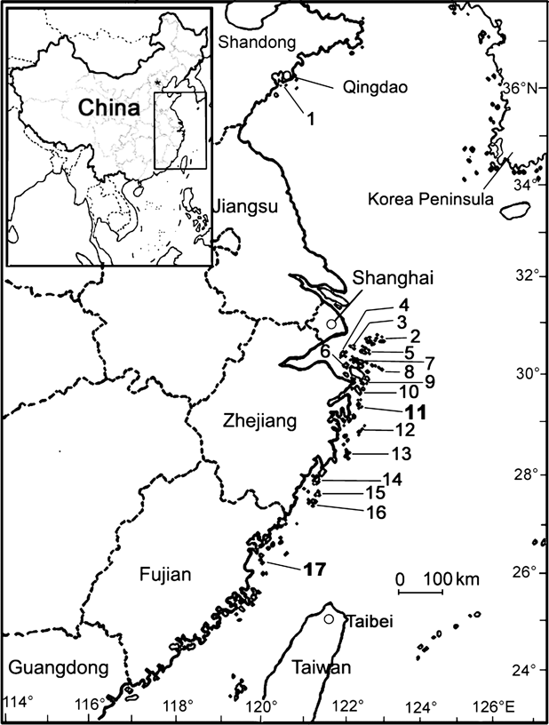 Fig. 1 The areas surveyed for the Chinese crested tern along the eastern coast of China in 2003–2007. 1, islands adjacent to Qingdao; 2, Shengsi Archipelago; 3, Qiqu Archipelago; 4, Huoshan Archipelago; 5, Qushan Archipelago; 6, Wuzhishan Archipelago; 7, Changtu Archipelago; 8, Zhongjieshan Archipelago; 9, Putuo and adjacent islands; 10, Meisan Archipelago; 11, Jiushan Archipelago; 12, Yushan Archipelago; 13, Taizhou Archipelago; 14, Dongtou Archipelago; 15, Beiji Archipelago; 16, Nanji Archipelago; 17, Matzu Archipelago. The two sites where the species was found (11 and 17) are in bold. The inset indicates the location of the main figure in China.