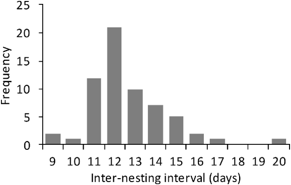 Between March 2004 and September 2007 a total of 55 nesting green turtles were tagged. Their CCL was 85–119 cm (mean 106.3±SD 6.1 cm, n=61) and their CCW 79–140 cm (mean 100±SD 7.5 cm, n=61). Mean clutch size was 112.01±SD 23.22 (range 35–182, n=347). The modal observed inter-nesting interval was 12 days (Fig. 3), with a mean interval of 12.9±SD 2 days (range 9–20, n=73). Tagged green turtle females accounted for 29% (n=149) of all nests laid during the study, which makes it difficult to ascertain the clutch frequency. If, however, we consider that each female deposits a mean of 2.5 clutches per year (Table 1), we estimate that c. 50 females breed each year.