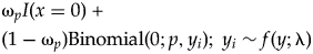 $\eqalign{&{\rm \omega }_pI( {x = 0} ) \; + \cr &( {1-{\rm \omega }_p} ) {\rm Binomial}( {0;p,y_i} ) ;{\rm \; }y_i\sim f( {y;{\rm \lambda }} ) }$3.