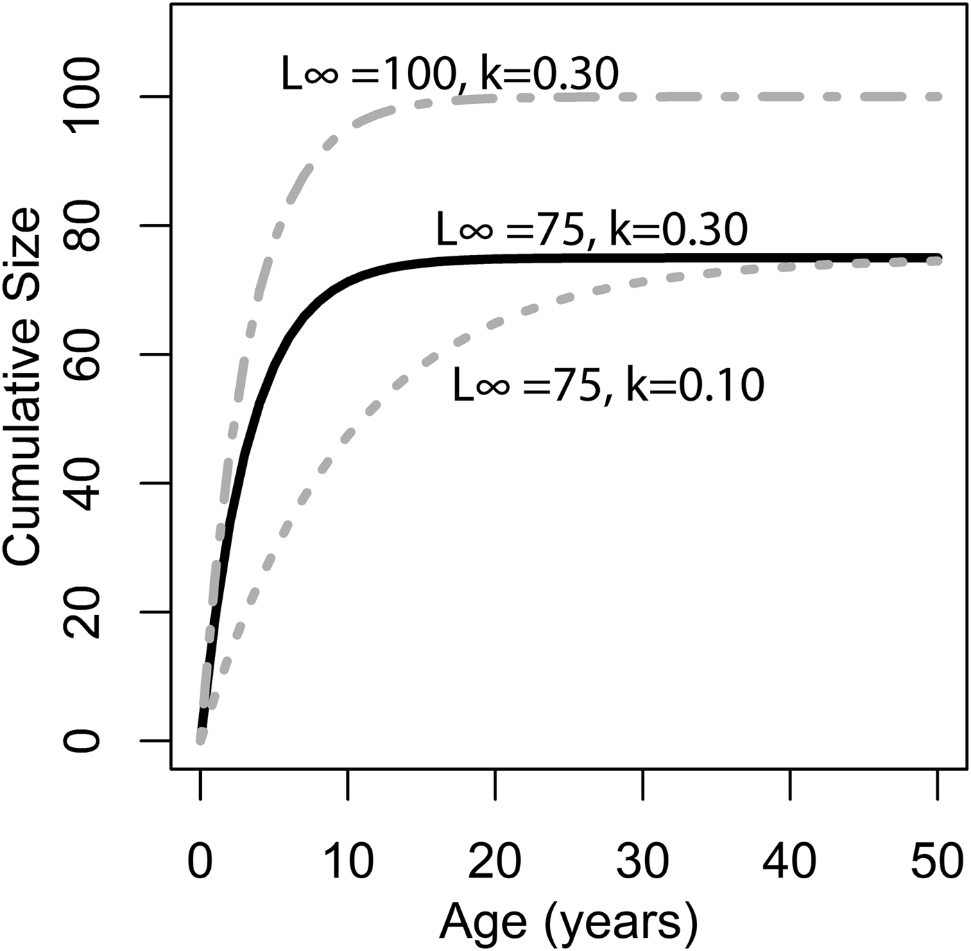 Figure 1. Illustration of changing L ∞ and k of the von Bertlanaffy growth equation (eq. 1). Solid black line: L ∞ = 75, k = 0.30, t 0 = 0. Dashed gray line: L ∞ = 50, k = 0.10, t 0 = 0. Dashed-dotted gray line: L ∞ = 100, k = 0.30, t 0 = 0. k is the rate at which L ∞ is approached. In the scenario of two organisms with identical k values but different L ∞ values (top two lines), the organisms with the higher L ∞ values would accrete more shell in terms of length per time. Alternatively, if L ∞ is identical, but k differs (bottom two lines), then the organisms with the higher k values would accrete more shell in terms of length per time. Thus, direct comparisons between taxa of k in terms of absolute growth rate cannot be made, because L ∞ may different. However, because k is the rate at which L ∞ is approached, it provides information on the growth strategy of the organism in question and may also provide insights into ecology.