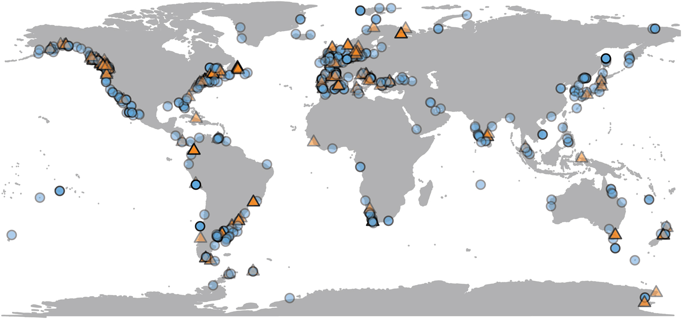 Figure 2. Geographic distribution of growth parameter observations, plotted at 50% opacity. Localities with only chlorophyll or temperature data available are plotted as orange triangles; those with both are plotted as blue circles (see online version for colors). N = 688.