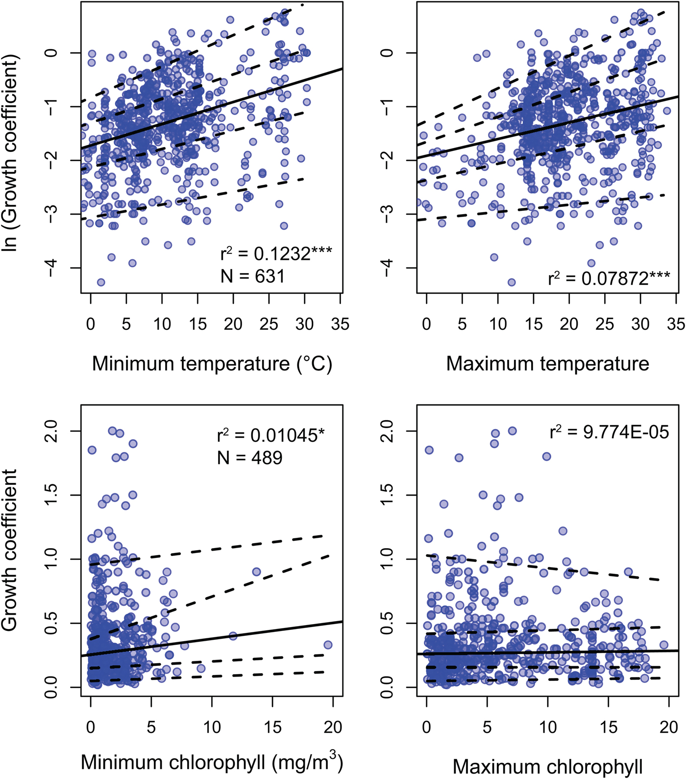 Figure 3. Linear regression and quantile regression plotted for minimum and maximum temperature and chlorophyll-a concentration. The 5th, 25th, 75th, and 95th conditional percentiles of the response variable are shown as dashed lines. Tests of equality of slopes reveal that only maximum temperature is associated with a change in the spread of growth coefficient (Supplementary Data 4). Sample sizes and coefficients of determination are shown for each regression. Sample sizes are identical for minimum and maximum predictors. *p < 0.05; ***p < 0.0005.