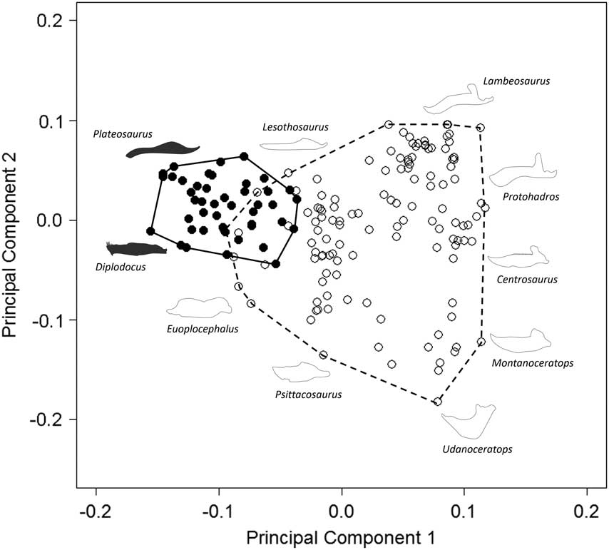 Figure 1 Patterns of morphospace occupation for herbivorous nonavian ornithischian and sauropodomorph dinosaurs. PC1 and PC2 account for 50.4% of variation. Ornithischian and sauropodomorph taxa occupy significantly different regions of shape-based morphospace (p<0.05). Filled circles, Sauropodomorpha; open circles, Ornithischia. Silhouettes represent jaw profiles found in that region of morphospace.