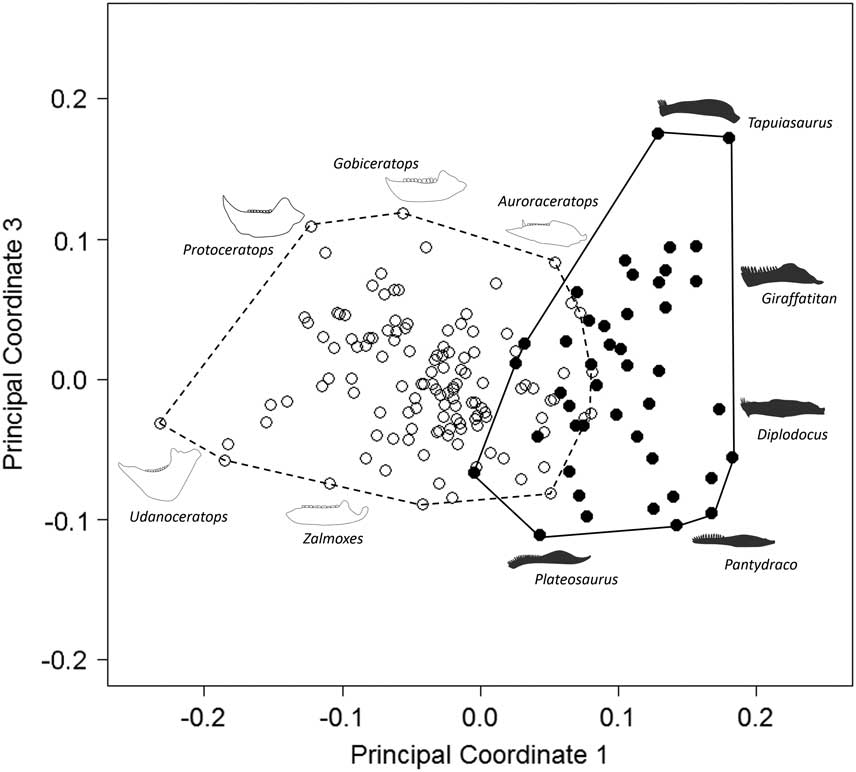 Figure 3 Patterns of biomechanical morphospace occupation for herbivorous nonavian ornithischian and sauropodomorph dinosaurs. PCo1 and PCo3 account for 23.9% of variation. Ornithischian and sauropodomorph taxa occupy significantly different regions of biomechanical morphospace (p<0.05). Filled circles, Sauropodomorpha; empty circles, Ornithischia. Silhouettes represent jaw biomechanical profiles found in that region of biomechanical morphospace.