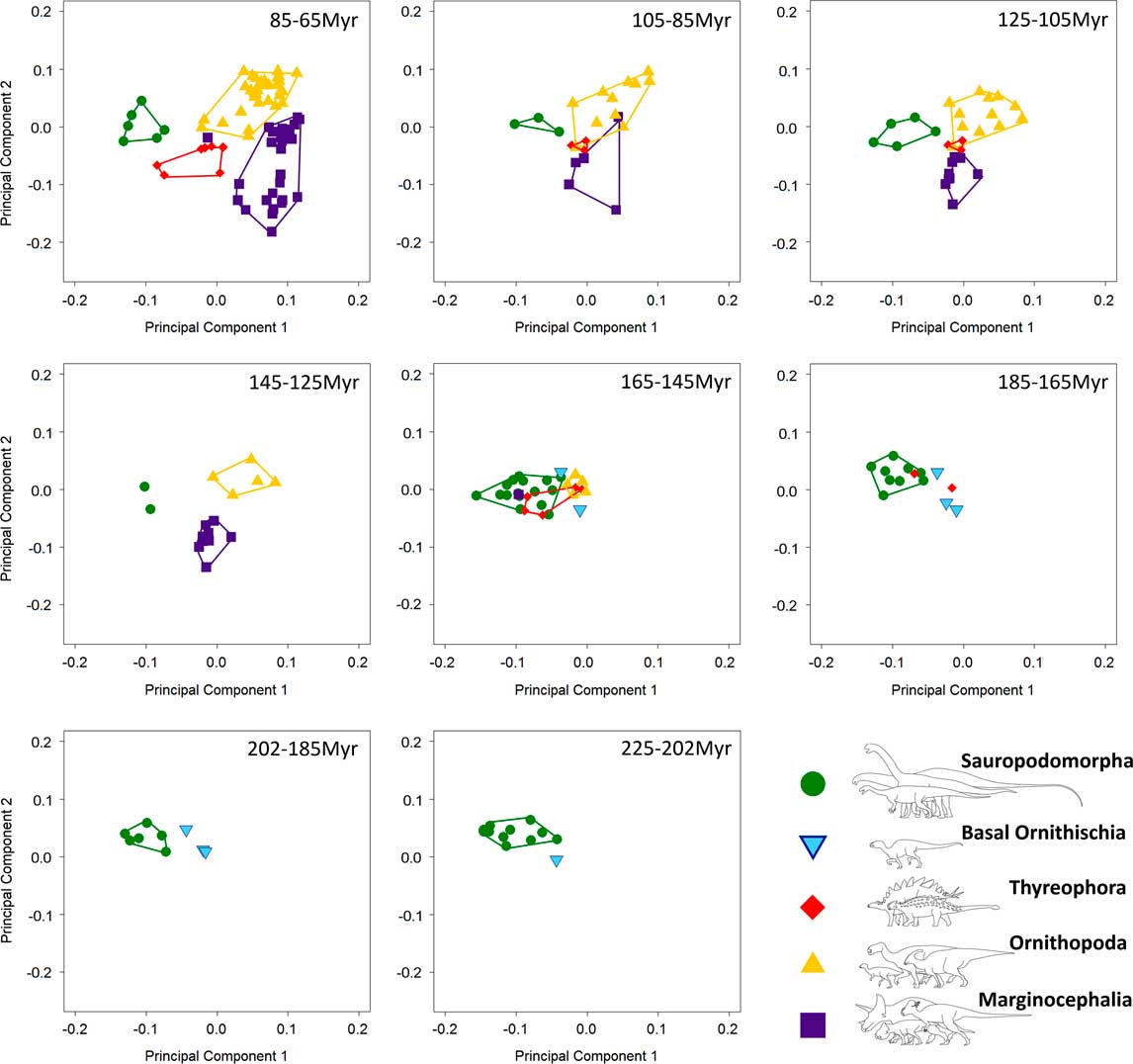 Figure 4 Patterns of morphospace occupation for herbivorous nonavian dinosaurs through the Mesozoic (20 Myr time bins), based on PC1 and PC2 (accounting for 50.4% of variation). Sauropodomorpha occupy isolated regions of morphospace for the majority of the Mesozoic, with overlap between North American sauropods and thyreophorans between 185 and 145 Ma.