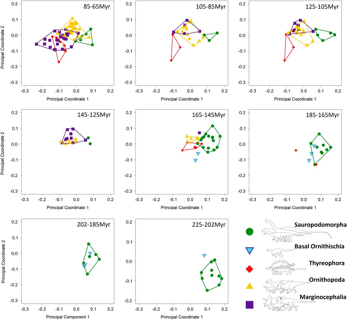 Figure 5 Patterns of biomechanical morphospace occupation for herbivorous nonavian dinosaurs through the Mesozoic (20 Myr time bins), based on PCo1 and PCo2 (accounting for 25.2% of variation). Sauropodomorphs predominantly overlap only with heterodontosaurids (202–145 Ma). Aptian–Maastrichtian marginocephalians and ornithopods occupy similar regions of morphospace (125–65 Ma).
