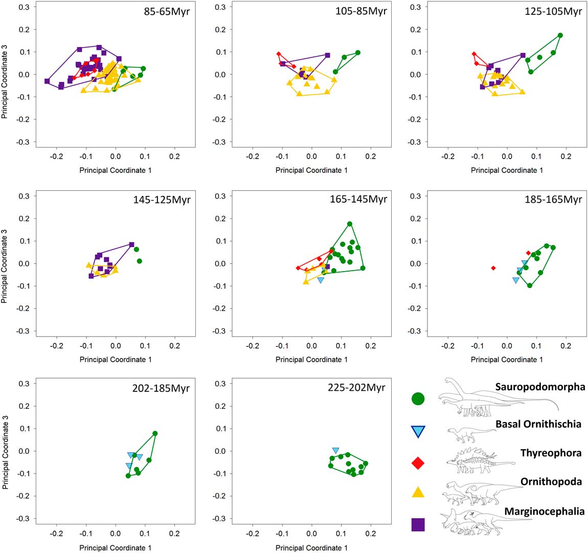 Figure 6 Patterns of biomechanical morphospace occupation for herbivorous nonavian dinosaurs through the Mesozoic (20 Myr time bins), based on PCo1 and PCo3 (accounting for 23.9% of variation). Sauropodomorphs overlap very little with contemporaneous taxa before the latest Cretaceous (85–65 Ma). Albian–Maastrichtian marginocephalians and thyreophorans occupy similar regions of biomechanical morphospace (105–65 Ma).