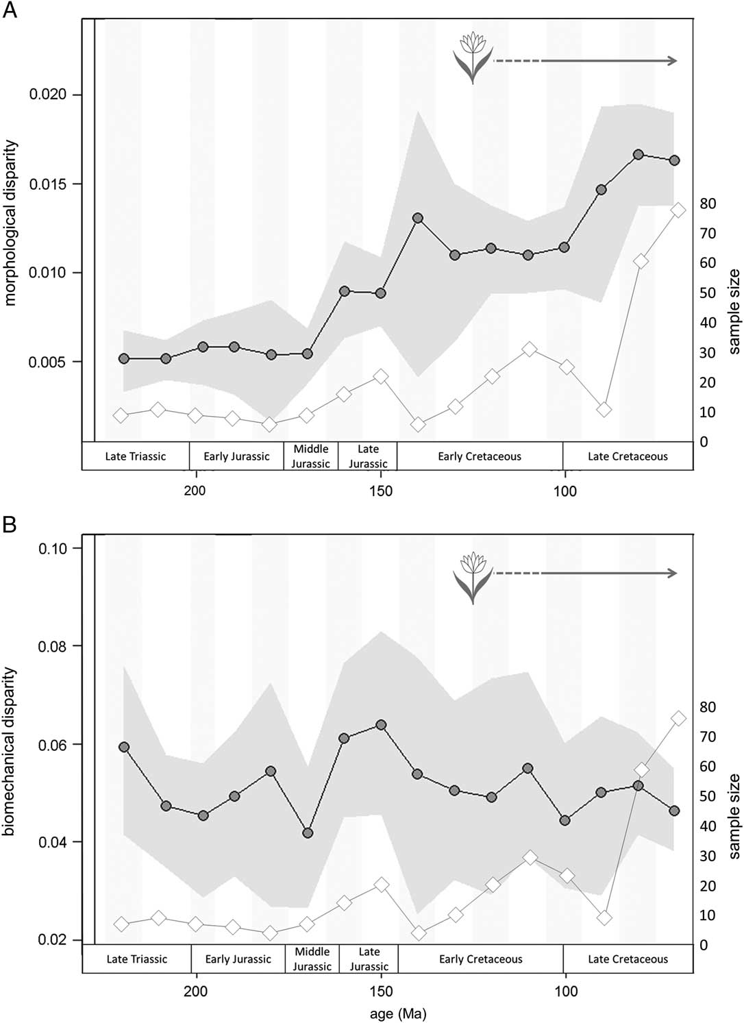 Figure 7 Comparison of shape-based and biomechanical disparity curves across 10 Myr time bins based on sum of variance metric. (A) shape-based disparity; (B) biomechanical disparity. Morphological and biomechanical disparity curves are decoupled, with morphological disparity increasing through the Mesozoic and biomechanical disparity peaking in the latest Jurassic. Shaded region spans the 95% confidence intervals based on 1000 bootstrap replicates. Disparity (dots) is plotted alongside jaw specimen sample size curve (diamonds). Flower represents earliest fossil angiosperms (Sun et al. Reference Sun, Ji, Dilcher, Zheng, Nixon and Wang2002; Du and Wang Reference Du and Wang2015).