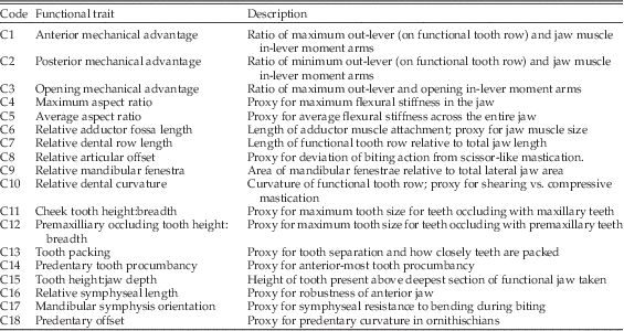 Data for 2D landmark and biomechanical trait analyses were compiled from 167 sauropodomorph and ornithischian dinosaur taxa (see Supplementary Information, Appendix 6). Herbivorous nonavian theropods were excluded from this data set, as complete mandibular material for these animals is rare. A mandibular biomechanical profile represents a good proxy for characterizing the feeding system, as the mandible is primarily adapted for feeding, whereas the cranium has multiple functional roles, some of which are unrelated to feeding, such as housing the brain and sensory organs (Hylander et al. Reference Hylander, Picq and Johnson1991; Hylander and Johnson Reference Hylander and Johnson1997).
