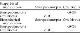 Table 2 Results of significance testing (NPMANOVA) on morphospace occupation (PC1 and PC2) and biomechanical occupation (PCo1 and PCo2; PCo1 and PCo3) between Ornithischia and Sauropodomorpha (at p<0.05).