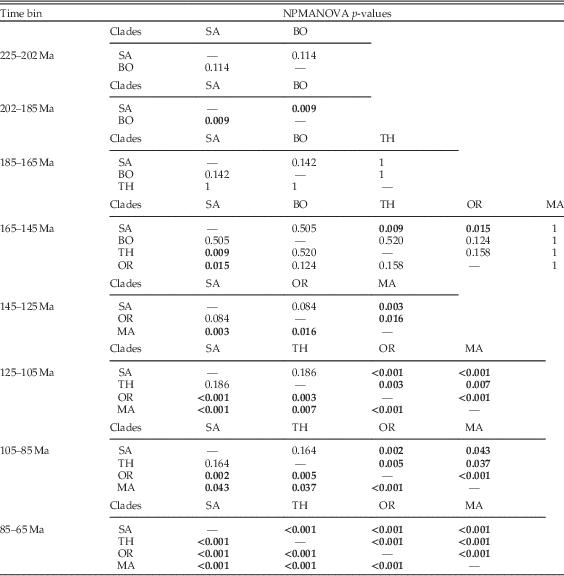 Table 3 NPMANOVA significance testing between clade occupations of biomechanical morphospace through time. Bold p-values represent significant differences (at p<0.05). SA, Sauropodomorpha; BO, Basal Ornithischia; TH, Thyreophora; OR, Ornithopoda; MA, Marginocephalia.