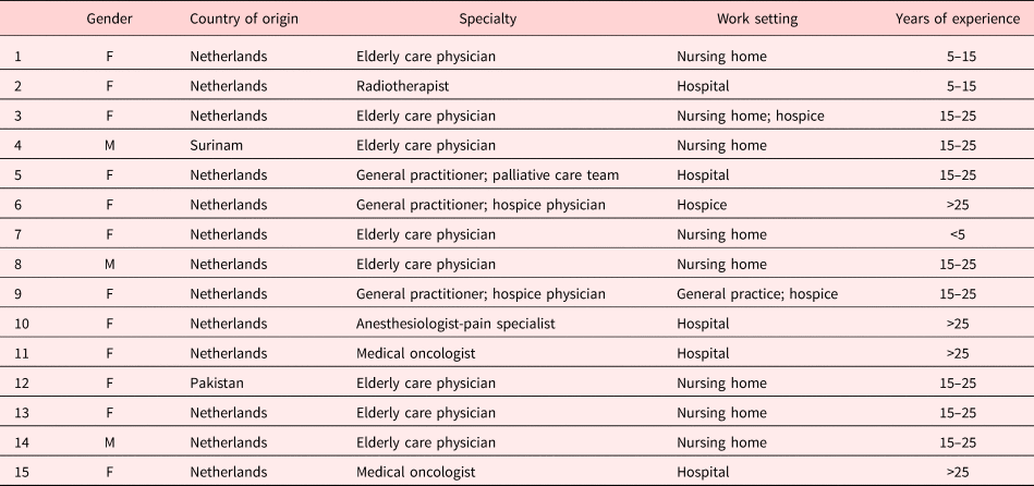 Participants were recruited through purposive and convenience sampling (Pope and Mays, Reference Pope and Mays2006). In total, 24 physicians were approached by email, of whom 15 participated. Participants were recruited through contacting our own network of general practices, nursing homes, hospices, and hospitals. In addition, physicians outside our network were approached because we expected them to be experienced in palliative care for migrants. One reason for nonparticipation was because physicians felt they had too little experience with the target population. For the others, the reason is unknown. We reached physicians with substantial experience in palliative care, including for people with non-western backgrounds, and diversity in years of experience, experience in palliative care, experience with palliative care for patients with non-western backgrounds, medical specialty, and ethnic background (Table 1). Twelve participants were female (80%), two participants had a non-western background themselves (13%), and the average years of experience across all participants was 15–25 years.