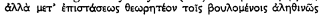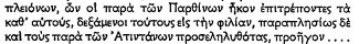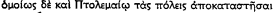 ; which Livy (XXXII 33, 3) translates: ‘restituenda … loca quae post pacem in Epiro factam occupasset’. This was challenged by Zippel, mainly on the grounds that Philip could not have occupied Roman territory (‘römisches Gebiet’) without its being explicitly mentioned in our sources (pp. 73 f.); and he suggested that Polybius means ‘the territories … he had acquired after and in accordance with [‘nach … und gemass’] the Peace …’ (e.g. Atintania). This suggestion has been generally followed (e.g. Holleaux, Rome, p. 278, n. 1; Walbank, p. 103, n. 4; but not De Sanctis iii 2, p. 435, n. 2—unfortunately without discussion). Yet not only is it doubtful whether the Greek as cited can mean this: if we look at the context, it is at once clear that Zippel's interpretation cannot stand. Polybius (l.c.) continues: ![]()