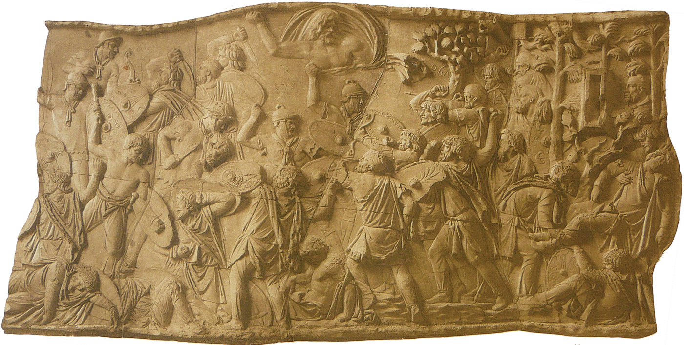 Decebalus’ appearances on the relief are framed by two in which the trees have a central role in the scene's events. His first appearance, in scene XXIV, is one of surveillance, as he watches from the back as the armies clash in the opening battle of the relief, likely the second Battle of Tapae, which was won by the Roman forces (Fig. 3). The trees that dominated the previous scene, one of Roman deforestation, reappear at the close of this one, as the Dacian troops attack from the forest that shelters their watching king. He hides underneath a resinous tree and behind an unusually small deciduous tree with broad palmate leaves, identified by Stoiculescu as a service tree, and is the final figure in the top half of the scene. This first appearance of Decebalus is clearly not a positive one, and attention is drawn to him by the projected line of the thunderbolt wielded by Jupiter Tonans, seen here to the upper left of Decebalus, slightly to the right of the centre of the battle. This is simply conjecture, since the thunderbolt itself is missing, but by extending Jupiter's line of sight, and combining it with the direction of his throwing arm, we find that he appears to be aiming at the Dacian king (Settis et al. Reference Settis, La Regina, Agosti and Farinella1988: 146). Lepper and Frere (Reference Lepper and Frere1988: 68) wondered whether this was the sole purpose of the deity's inclusion in the relief, or whether it was instead to indicate the thrust of the Roman forces, who advance into the forest under divine direction, or whether Jupiter Tonans’ function is perhaps to indicate that the battle occurred during a thunderstorm (as Cichorius had earlier suggested), and to further imply the ‘general support of Olympus’ for the Roman cause. The ultimate conclusion, of course, is that the figure of Jupiter Tonans can have all the above functions, but the most obvious one to a viewer is the literal interpretation, that the god is aiming his wrath at the hiding Decebalus.