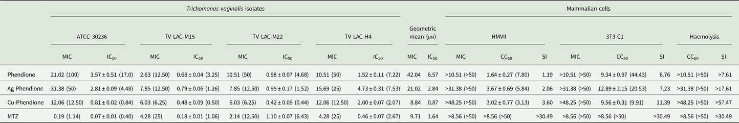 Metal-based drugs are already used in therapies as cisplatin with platinum for cancers’ treatment and gold-based drugs as auranofin in rheumatoid arthritis (Allardyce & Dyson, Reference Allardyce and Dyson2016). Indeed, auranofin has been demonstrated anti-T. vaginalis effectiveness in vitro and in vivo, presenting IC50 values of 0.4–2.5 µ m (Hopper et al., Reference Hopper, Yun, Zhou, Le, Kehoe, Le, Hill, Jongeward, Debnath, Zhang, Miyamoto, Eckmann, Kirkwood and Wrischnik2016). In this context, we highlight the metal-based compound Cu-phendione, which demonstrated high activity against this parasite, with MIC value of 8.84 µ m and IC50 0.87 µ m, and more effective than MTZ.